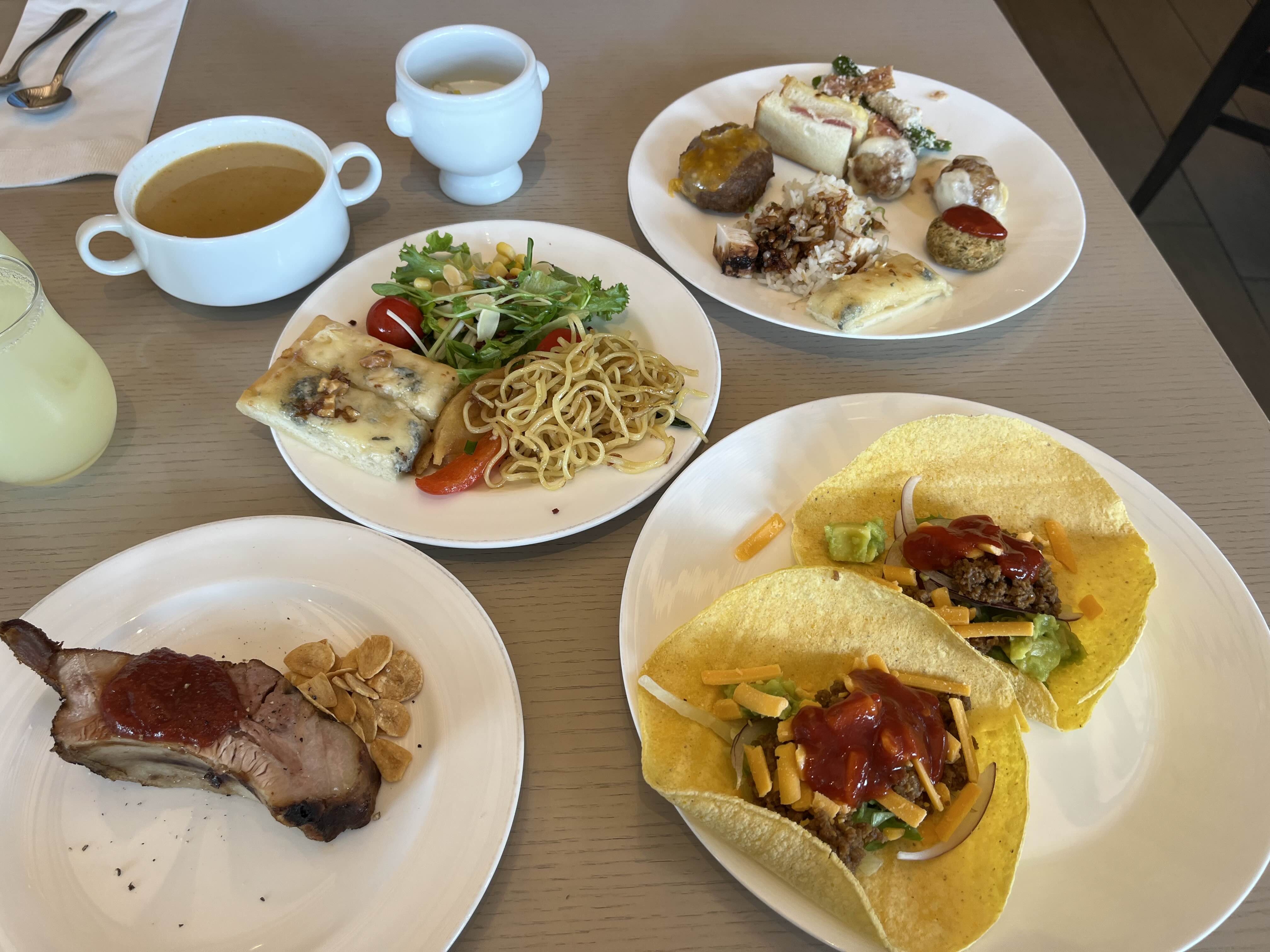 뷔페 테이블에는 일본, 서양, 그리고 세계 각국의 요리가 고루 준비되어 있었습니다.