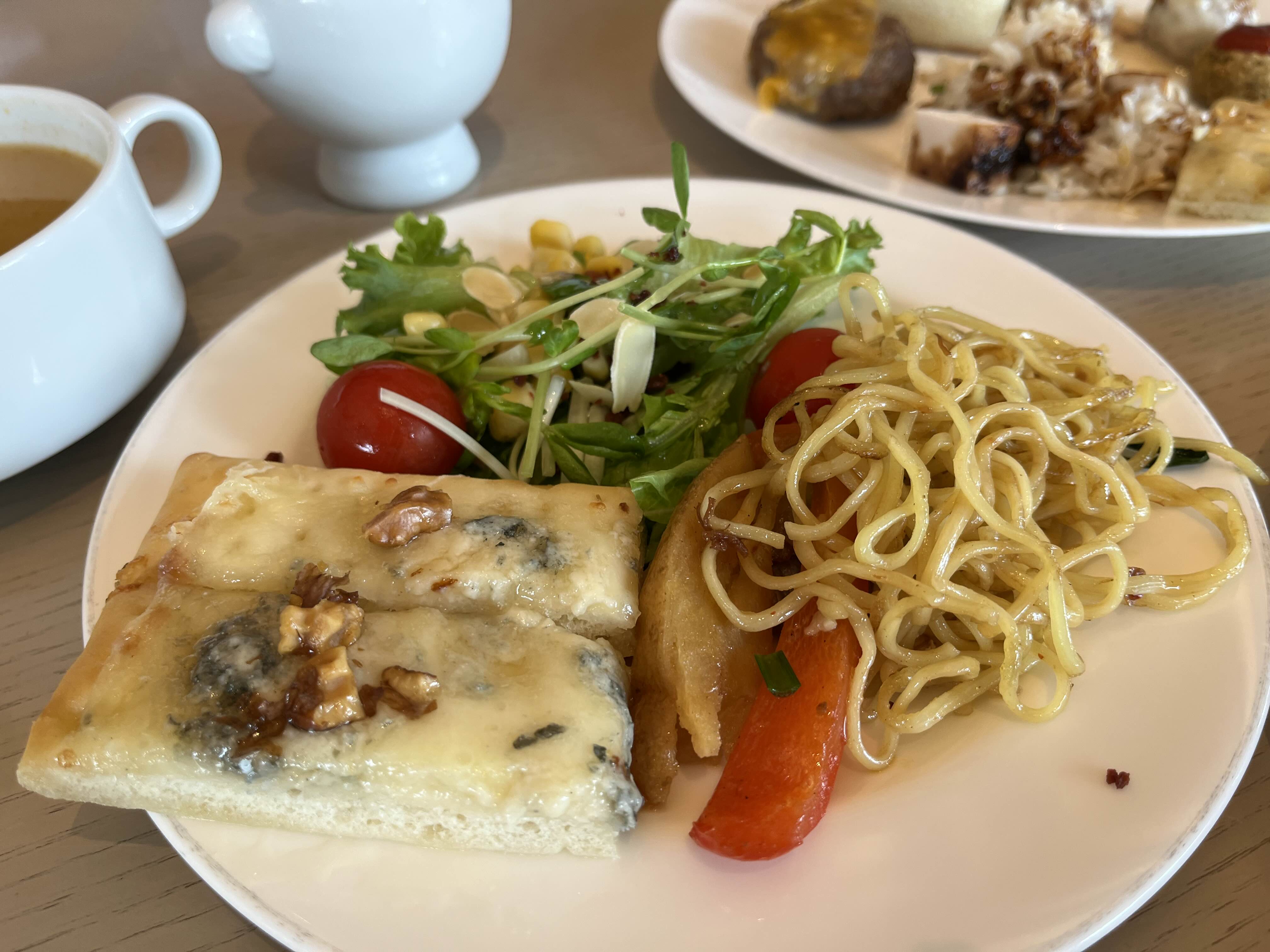 고르곤졸라 피자, 샐러드, XO 간장 베이스인 누들